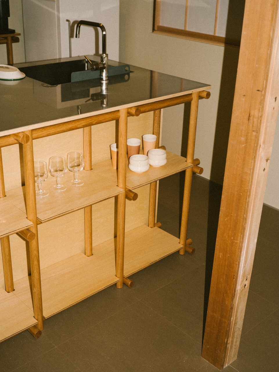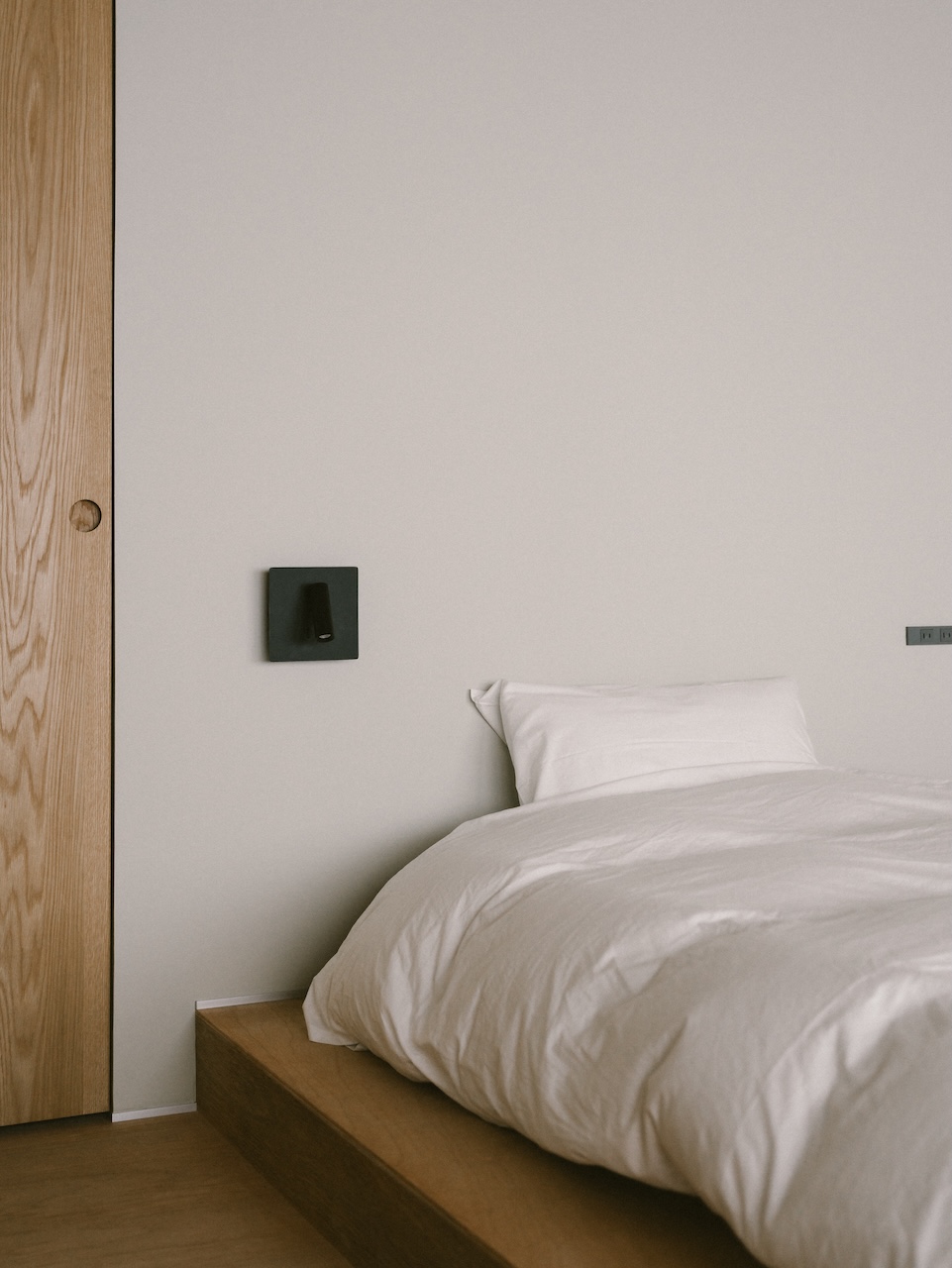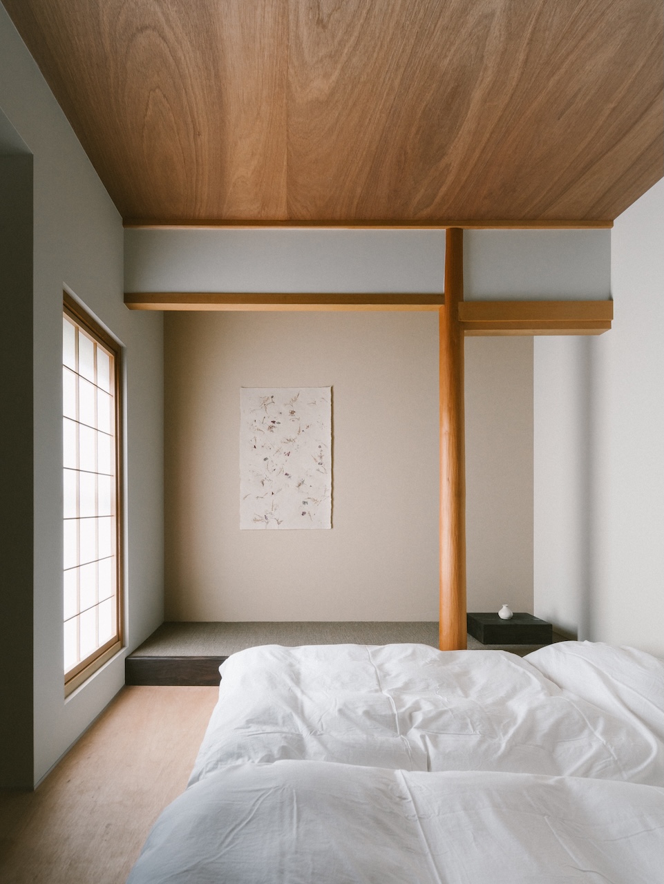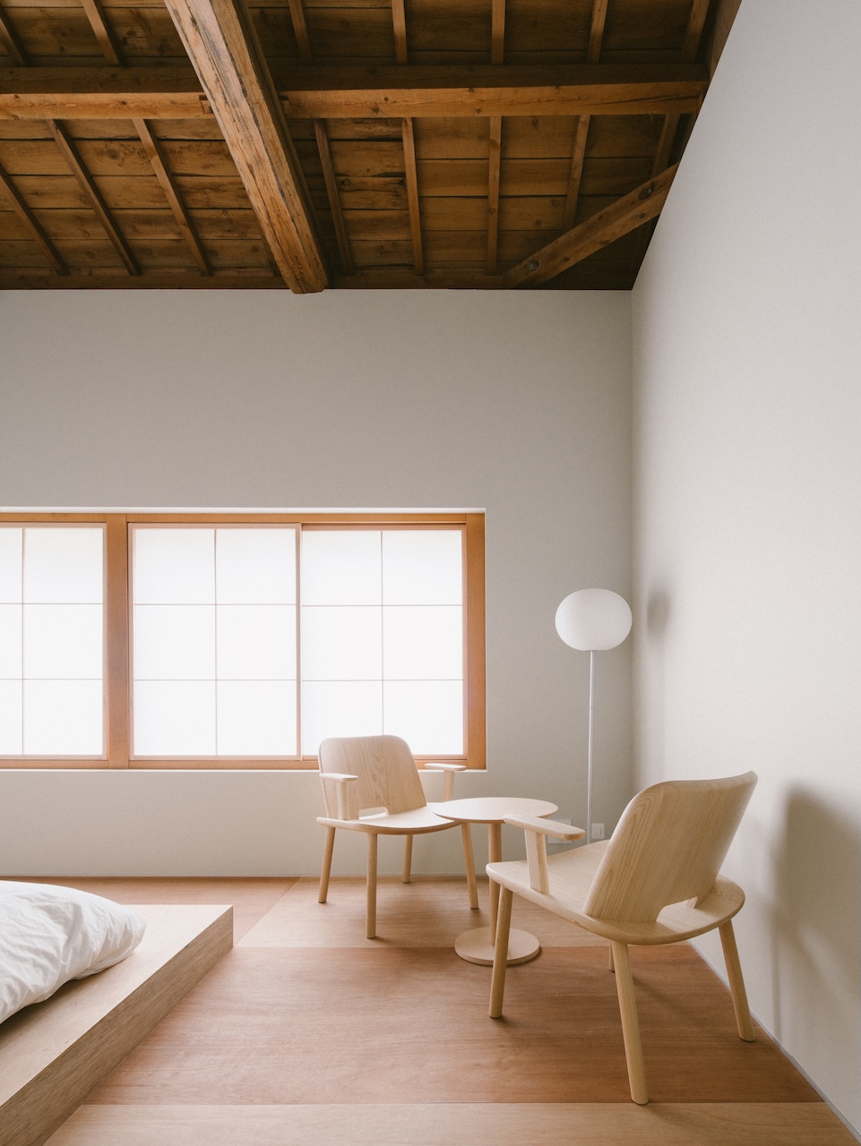 This maisonette-style room accommodates up to two guests. The shower room is on the first floor, and the bedroom is on the second. The exposed ceiling preserves the traditional charm of the machiya townhouse. The interior is minimally furnished, featuring tactile pieces such as a lounge chair designed by Jasper Morrison. When you open the window, you have a view of Ishiura Shrine, said to be the oldest in Kanazawa, right in front of you.
